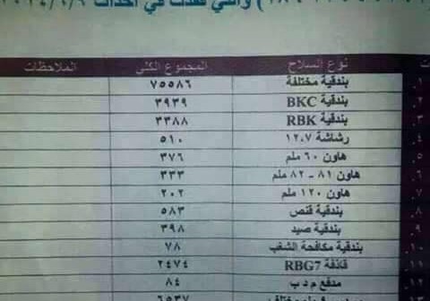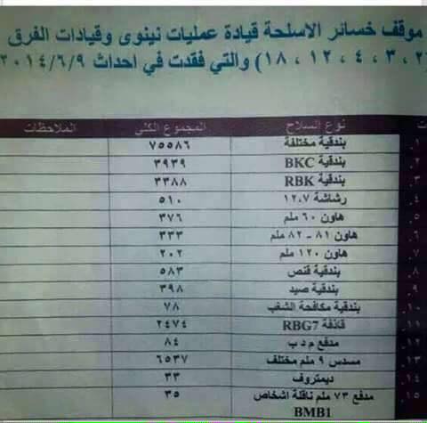 بهپێى بهڵگهیهكى لیژنهى بهرگرى و ئاسایش له ئهنجومهنى نوێنهرانى عێراق. زیاتر له 100 ههزار پارچه چهك له رۆژى یهكهمى داگیركردنى موسڵ كهوتۆته دهست داعشهوه. ئهو بهڵگهیه نیشانى ههموو جۆره چهكهكان نیشان دهدات. كهلهوانه نزیكهى 75 ههزار جۆرى جیاجیاى تفهنگ و نزیكهى 40 ههزار بی كهى سییه. ئهمه جگه له هاون و جۆرهكانى دیكهى چهك ههموو ژمارهكان له بهلگهكه هاتووه.